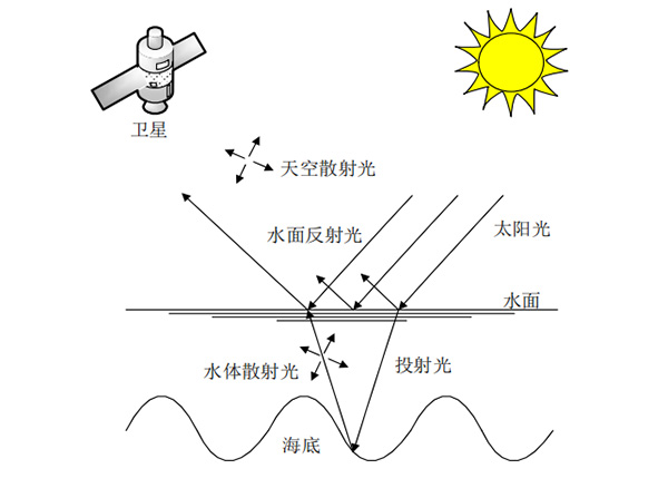 自然界中的全部物質(zhì)都具有光譜特征,不同物質(zhì)的光譜特性不同,光譜的差異與物質(zhì)的差異呈正相關(guān)。海洋水質(zhì)遙感監(jiān)測(cè)的原理是根據(jù)純凈水體和其他水體具有不同的光譜特性,在衛(wèi)星上搭載傳感器接收一定波長(zhǎng)范圍內(nèi)的輻射值,分析水質(zhì)參數(shù)對(duì)特定波長(zhǎng)的光的吸收和散射情況,結(jié)合光譜和水質(zhì)參數(shù)濃度的數(shù)學(xué)關(guān)系,最終反演出各種水質(zhì)參數(shù)的濃度值。如下圖所示,衛(wèi)星遙感監(jiān)測(cè)時(shí)衛(wèi)星上的傳感器接收到三部分的太陽(yáng)輻射:
